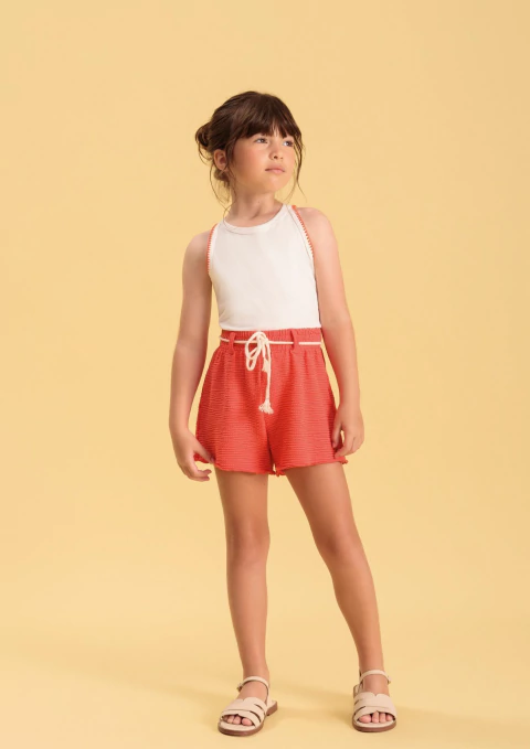 Conjunto infantil composto por blusa cotton cor off-white com gola arredondada e shorts em tecido anaruqá, com amarração ajustável e modelagem soltinha.